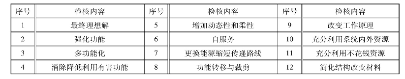把最终理想解和前面一章“提高理想度的一般方法”的十几条方法,列成如下所示的“技术系统理想化的检核表”,以供任何技术系统进行专项的理想化检核,逐一比对,采取措施,以提升技术系统的理想化水平。