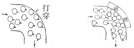 这里是一个完整物场,两物是管子和钢珠,场是钢珠对管子撞击的机械场,是一个能完成功能的不完善物场。不完善是两物之间发生有害效应,撞坏管子。用解决物场矛盾的一个一般法则,就是在两物之间引进第三种物质,它是两物之一或其变种。这一条法则也是在说,解决矛盾要尽可能运用系统资源。显然,这里就是要用钢珠隔在钢珠与管子之间,防止钢珠撞击管子。具体的方法就是在弯管的外面,包了一块磁铁,把一部分钢珠吸在管壁上。让飞来的钢珠打在自己身上,从而保护了管壁(图9-4)。这也就是让破坏者当了保护者。