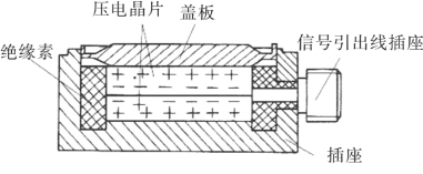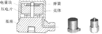 基座连接在振动体上。片弹簧将质量块压在压电晶体上。振动时,由于惯性,质量块有一个与加速度成正比的交变力作用在压电晶体上。在其两面产生电荷。由引线输出。输出信号与作用力成正比,即与加速度成正比。从而可以测出加速度。