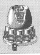 第二个过程,从物理效应到具体方案。把物理效应的原理,转换成一个具体的方案。这里具体要做的是要有一个交变磁场,并把交变磁场渗透到钢水中去,这样一个实体就是一个电磁搅拌器,这已经有现成的产品了。根据钢水所处的状态,电磁搅拌器的结构形状有各种形式。这里介绍的电磁搅拌器,是把溶化金属的电炉就像锅一样坐在一组线圈之上。线圈与发电机线圈绕组相类似,产生的交变电磁场作用于炉中的液态金属就能产生搅拌运动(图10-3)。