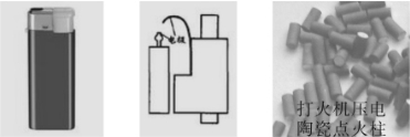 以前的打火机(图10-34)用火石打火,火石磨完了换火石。后来用压电陶瓷片代替火石。压下打火机,撞击压电陶瓷产生电荷,由两面引线形成的电极之间产生3000伏的高压,跳出火花点燃气体。这是可连续打火几万次的气体电子打火机(图10-35)。