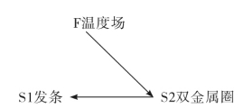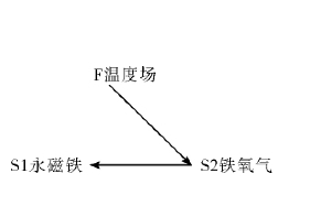 我们使用的电饭锅电源自动关断,就利用了磁性材料的居里点的特性。在电饭锅的底部中央装了一块磁铁和一块居里点为105℃的磁性材料。见下面的开关原理图(图10-12),开始时,温度低,磁性材料有磁性,压下手动开关,克服弹簧的弹力,使永久磁铁吸住磁性材料,并带动下端的触点开关闭合,电源接通,开始加热烧饭。当锅里的水分干了以后,食品的温度将从100℃上升。当温度到达大约105℃时,由于被磁铁吸住的磁性材料的磁性消失,磁铁就对它失去了吸力,这时磁铁和磁性材料之间的弹簧就会把它们分开,同时带动电源的开关断开,停止加热。这是一个完整物场。两物是电饭锅电路开关永久磁铁与铁磁物质,一场是温度场。其物场模型如图10-13所示。