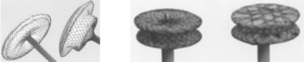 记忆合金心脏房间隔缺损封堵器,双头,收成一条线。通过血管进入心脏房间隔缺损位置再张开,如图10-21。