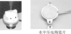 超声波加湿器的水中固定有一块压电陶瓷片,给压电陶瓷片通高频电压产生超声波振动,将水雾化,用一小风扇将雾气从孔中吹出,增加房间湿度。