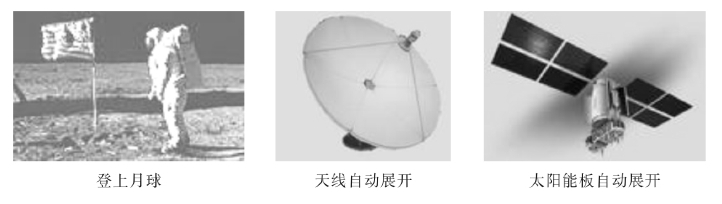 1969年宇航员登上月球,放置了一个直径数米的半球形天线。这么大的天线,是如何送上月球的呢?就是应用了形状记忆合金。天线用极薄的记忆合金先在地面正常情况下按预定要求做好,然后降温把它压成一团,把体积缩小到原来的千分之一,装进登月舱带上月球。放到月面上以后,在阳光下温度升高,达到记忆温度时,天线恢复成巨大的半球形。同样卫星的太阳能板也采用记忆合金制成上天后自动展开(图10-16)。