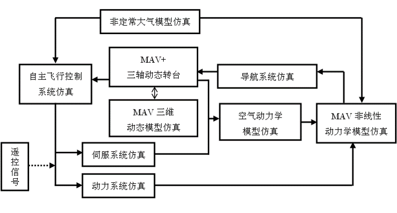 ①无人机相对大型有人飞行器①而言,一般具有较小的尺寸,特别是微小型无人机,尺寸上的限制使得其自主飞行系统在整体性能上表现出严重的不稳定性。系统各部分之间的相互干扰、剧烈的姿态变化影响机载部件的正常运行、系统不可靠性随运行时间增加的累积等等,这些因素都难以用正常的数学模型来加以描述,因此,需要将物理实物模型引入到无人机仿真系统;
