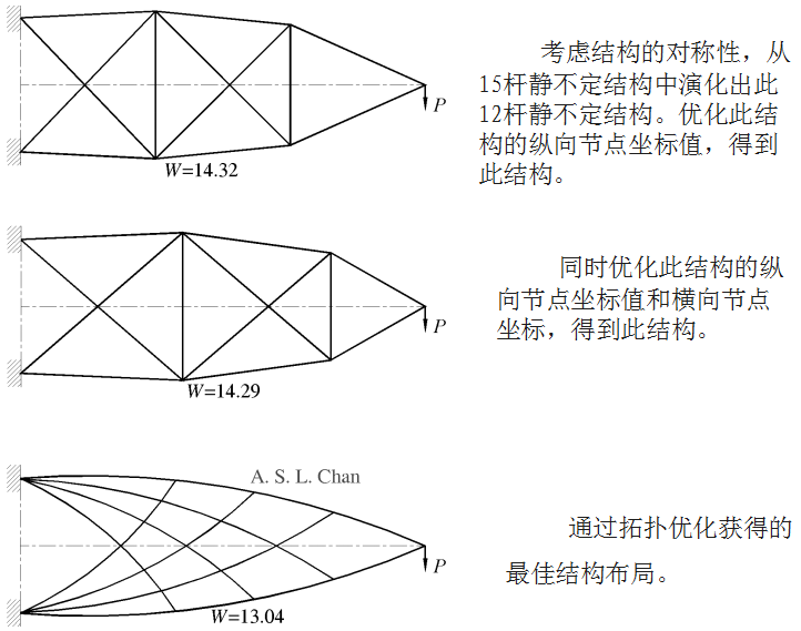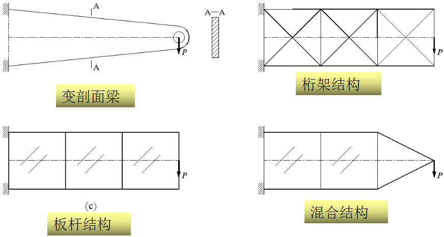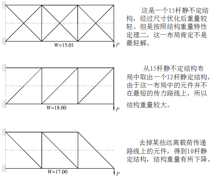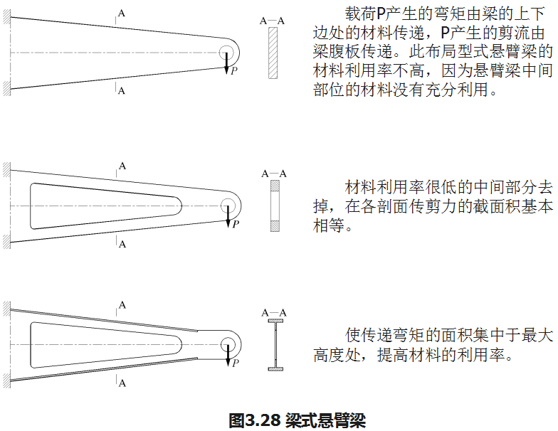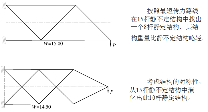 两杆布局十分简单,但是由于载荷P的作用方向和杆的轴线方向角度较大,传力并不有利。还存在压杆稳定性问题,这一布局型式不可取。但是当悬臂梁的跨度与高度相当时,这种型式就可取了。