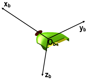 原点Ob取飞行器质心;纵向轴xb沿飞行器结构纵轴向前;竖向轴zb在对称平面内,垂直于纵轴,指向下;横向轴yb垂直于对称平面,指向右方。