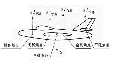 从该图可看出,由于机翼、机身的焦点都在无人机重心的前面,因而升力增量对重心形成一个使机头更加上仰的不稳定力矩,但水平尾翼焦点远在重心之后,因此尾翼上的升力增量对重心形成的是使机头下俯的稳定力矩,若后者大于前者,无人机是静稳定的,反之,则是静不稳定的。