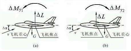 若无人机重心位于焦点之前,如图(a)所示,则在无人机受到外界扰动后,例如迎角增加了Δα,那么在无人机的焦点上,就会产生一个向上的升力增量ΔL,它对无人机重心形成使机头下俯的静稳定力矩ΔMy1,使无人机具有逐渐消除Δα而自动恢复到原来平衡迎角的趋势,即无人机是静稳定的。