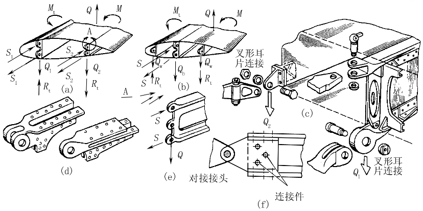 对于梁式结构,机翼的弯矩主要由机翼的梁集中传递,到了机翼根部,需要通过连接耳片传递到机身加强框的接头上。如果机翼的弯矩过大,就会造成机翼根部耳片接头上连接载荷过大,无法满足耳片的强度要求。这时就需要增加耳片接头数量,降低单个耳片接头的连接载荷,例如从单梁式结构过渡到双梁式,三梁式结构,或者是多梁式结构,接头数量的增加虽然可以降低连接耳片的强度,但是结果会导致结构重量增加,并且结构连接协调更加困难。