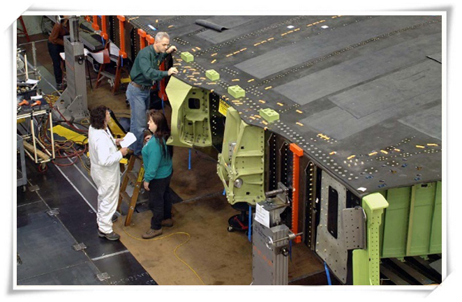 对于半硬壳式结构,机翼的蒙皮和桁条作为整体,形成一个刚度很大的承力结构,机翼的弯矩主要由这个半硬壳式结构整体传递。到了机翼根部,机翼连接接头不再是集中的耳片连接,而是分布的多钉螺栓连接,这样机翼蒙皮上的弯曲载荷可以通过这些分布式连接螺栓传递到中央翼结构上。由于没有集中连接,结构上没有参与区,结构的传力特性更好,重量更轻。