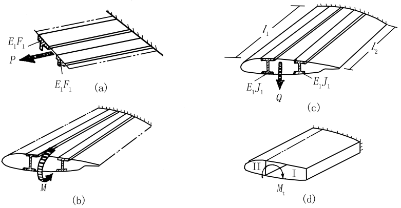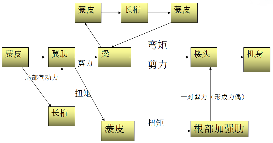 通过传力分析,我们可以大致了解机翼各个主要元件的受力特性和受力大小,然后可以采用基本的力学理论,例如工程梁理论,对其进行定性分析,确定基本结构尺寸,建立初步的结构力学模型,为后面进一步的细节计算打下基础。