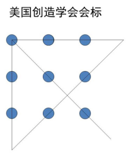 师: 心智模式也可以叫定势思维,就是我们看问题、想问题的习惯方法。我们每个人看问题想问题时都有一个固定的套路,当我们第一眼看到某个人或事物时,往往首先会采取这种习惯套路去思考和判断。也就是说,在你的内心存在一个对事物的比较固定的认知模式。现在,我们继续做这个游戏。刚才你们掌握了用四笔连接九子的画法,关键点就是要把直线画出正方形的边界,这种思维模式又叫越界思维。据说这张图是美国创造学会的会标。说明越界思维是很重要的创新思维方式。现在,我要求你们进一步用三笔把九个子连起来。(读者也可以试着在纸上画画。)