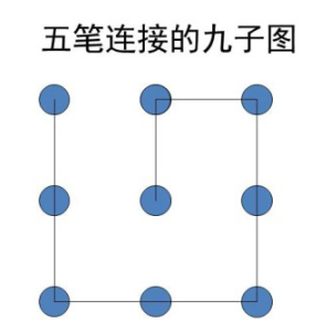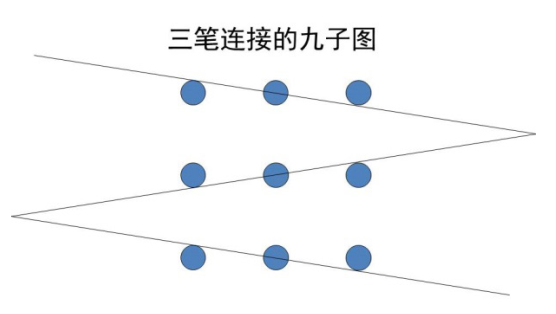 师: 其实心智模式并不都是不好的。我们每个人都是带着一种习惯模式或定势思维来看世界的,有时这个模式与外界事物的本质或规律正好近似,那么我们可以很快就对这个事物做出正确的判断;只有当我们的心智模式与事物的本质或规律不相吻合的时候,才会妨碍我们产生新的思维,这时心智模式就变成了心智枷锁。 要想实现思维创新,就必须打破心智枷锁。 现在,我再给你们提一个要求,你们能用一笔将这九个子连起来吗?