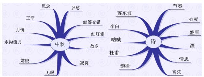 师: 是的,思维导图简单来说,就是一个围绕某个核心主题进行放射状思考的图形。当时我拿出一张白纸,在中间对折,在两边分别写上“中秋” 与“诗” 两个中心词,然后围绕这两个词自由联想,随时记下跳入脑海中的任何词,一口气分别写出了十个以上的词,如图6-1所示。
