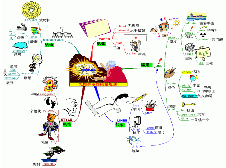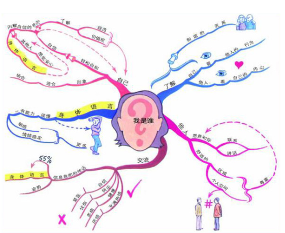 最后一个要素是颜色与图像。思维导图不仅可用文字表示相关主题和概念,还强调用图形、图像等来表示主题和相关概念,字体和线条的颜色也可以是彩色的,颜色与图形图像可以促进我们的右脑思考与形象思维,加深记忆与激发灵感。