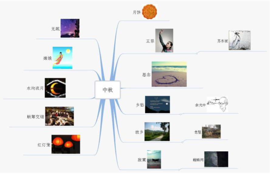于是我一边做饭菜,一边把原来那首中秋诗的联想图找出来,用上面的关键词去网上搜索,找到相应的图片放在思维导图的文字旁边,在检索图片的过程中又增添了几张联想的图片,就做出了图7-5所示的思维导图。