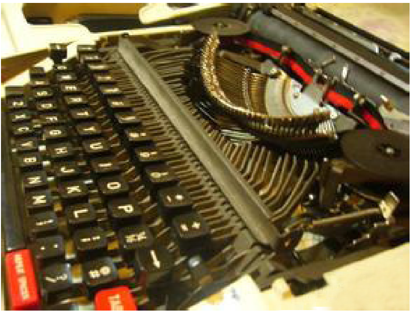 师: 你们可能没有用过老式的英文打字机,那种打字机是机械的,当你按下一个字母键的时候,长长的机械臂就把那个字母打在滚筒的纸上,如图8-3所示。如果打字员速度太快,机械臂就很容易碰到一起,绞在一起,要用手才能掰开,非常麻烦。所以有人想办法在键盘上下功夫,最简单的方法就是打乱26个字母的排列顺序,把较常用的字母摆在较笨拙的手指下,比如,字母“O”是英语中使用频率第三高的字母,但却把它放在右手的无名指下;字母“S”和“A” ,也是使用频率很高的字母,却被交给了最笨拙的左手无名指和小指