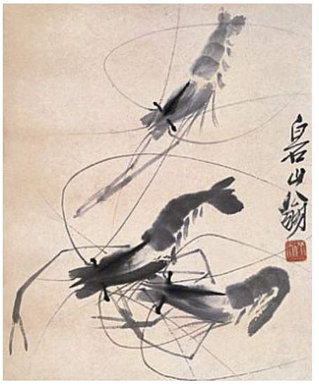 师: 齐白石很善于画虾,他画的虾只有寥寥几笔,连水也省略了。反而更加突出了水的清澈和虾的神态,如图8-2所示。这也是运用了简化思维。