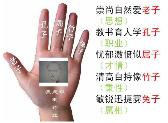 把自己的手掌放在一张A4纸上,用笔描出自己的掌型,五个手指形状代表五个思考方向,请从五个方面对自己进行创意自我介绍。比如将自己比作动物、植物、人物、物品等,并用文字(诗歌或短文)进行说明。图9-7所示是作者的一个示范,仅供参考。