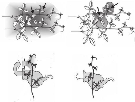 上面两幅图显示,海尔让甲虫侵害以灰色表示的叶子,然后检查同一株豆蔓和相邻另一株豆蔓上其他叶子周围的空气。上左图显示两株豆蔓上的所有叶子周围的空气中都含有相同的化学物质;上右图则显示当海尔把受害叶用塑料袋隔离之后,它们周围的空气异于两株豆蔓上所有其他叶子周围的空气。下面两幅图显示了海尔的第二个实验。他把来自受害叶的空气要么吹向同一株豆蔓的其他叶子(下左图),要么吹离这些叶子(下右图)。