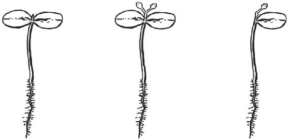 图中展示了三株亚麻(Linum usitatissimum)幼苗。左图是一株两周大的幼苗,它具备两枚子叶和一个顶芽(两枚子叶间的小突起)。中图是一株同龄幼苗,但其顶芽已被摘除,两个侧芽已经生长了大约一周。右图的幼苗则在摘除顶芽前还先除去了左侧的子叶。