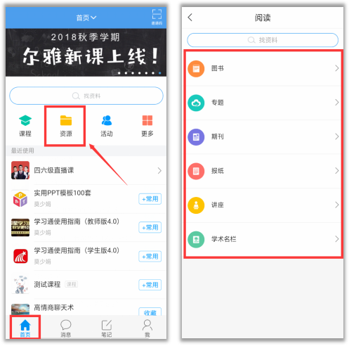 在学习通“首页”——“资源”,海量的阅读资源,任你搜索~