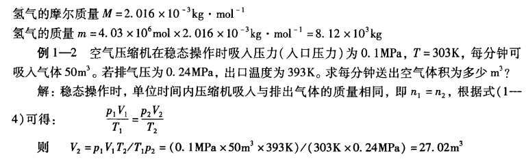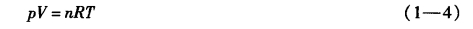 式(1—4)和式(1—5)叫做理想气体状态方程。理想气体状态方程所表示的关系非常简单,计算十分方便。虽然它只严格适用于理想气体,但也经常用于计算低压下的真实气体,当压力在1 MPa以下时,误差一般不大,计算结果能满足工程计算的要求。