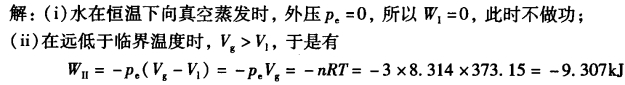 例2—2相变过程体积功的计算。将3mol的液态水在100℃及101.325kPa下恒温恒压汽化为同温同压的水蒸气,试分别计算下列两种过程的功。 (i)水在恒温下向真空蒸发; (ii)水经过无摩擦准静态过程恒温恒压蒸发为水蒸气。