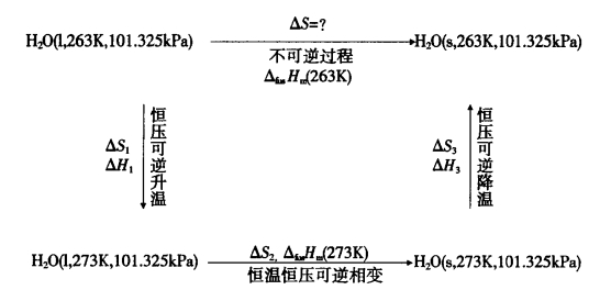 非平衡温度、压力下的相变,是不可逆相变过程。根据状态函数法的原理,求不可逆相变过程的熵变,可设计与其具有相同始终态的几步可逆过程,使相变在正常相变点进行。则各步熵变的代数和,即为该不可逆相变过程的熵变。