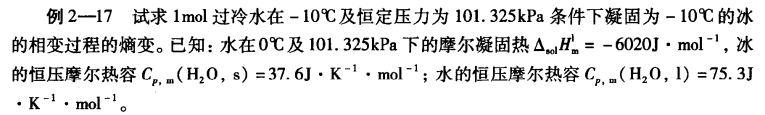 解: -10℃的过冷水结冰是在非两相平衡下发生的相变,这是一个不可逆相变过程。要计算此过程的状态函数熵的变量ΔS,根据状态函数法,可在相同的始终状态之间设计三步可逆过程: (1)-10℃的水恒压升温到0℃; (2)0℃的水在正常凝固点结冰; (3)0℃的冰恒压降温到-10℃。即: