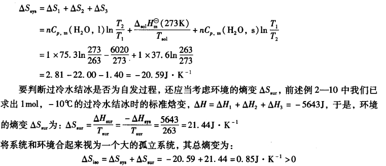 可见,过冷水结冰是自发过程,说明-10℃的过冷水不稳定,而固态冰相对稳定。