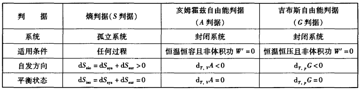 综上所述,从热力学第二定律引出了熵判据(S判据),而在熵的基础上又引出了亥姆霍兹自由能判据(A判据)和吉布斯自由能判据(G判据)。这两个新的热力学判据克服了总熵判据的两个不足之处,即能够直接利用系统热力学函数的变化进行判断,不用再去考虑环境的热力学函数的变化。同时,它不仅能判断过程进行的方式(可逆和不可逆),而且能直接判断过程进行的方向和限度(自发和非自发)。三种热力学判据各自的适用条件如表2—2所示。