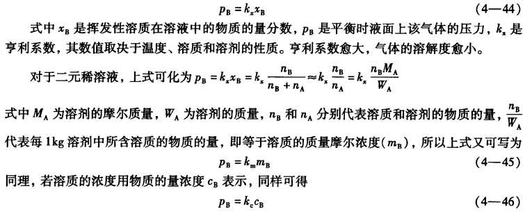 “在一定温度和平衡状态下,气体在液体里的溶解度(物质的量分数)和该气体的平衡分压成正比。”此叫做亨利(Henry)定律。从另一角度,该定律可表述为“挥发性溶质在气相中的平衡分压与溶质在溶液中的物质的量分数成正比”。用式表示为