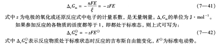 式中E是可逆电池的电动势,Q是电池在反应时通过的电量,n为电池输出基元电荷的物质的量,单位为mol, F是法拉第常数。如果可逆电池电动势为E的电池按电池反应式,当反应进度ξ=1 mol时的吉布斯自由能的变化可表示为