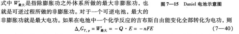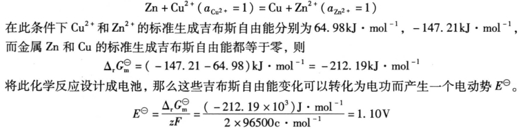 将一个化学反应的化学能转变为电能时,它们之间的定量关系可以通过化学热力学来讨论,在第三章中已指出,在等温等压条件下,当体系发生变化时,体系吉布斯自由能的变化等于体系在可逆过程中所做的最大非膨胀功(本书采用体系对环境做负功),即