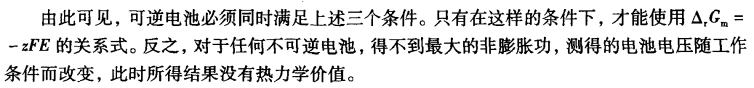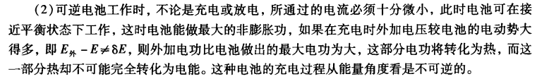 上述的式(7—40)(7—41)和(7—42)是对可逆电池而言,因为只有可逆电池才能做出最大非膨胀功。可逆电池是指电池中的过程是以热力学可逆方式进行的。根据热力学中对可逆过程所下的定义,可逆电池必须具备如下三个条件:向进行。例如铅酸蓄电池,当电池电动势稍大于外加电动势时,电池放电,电极反应分别为: