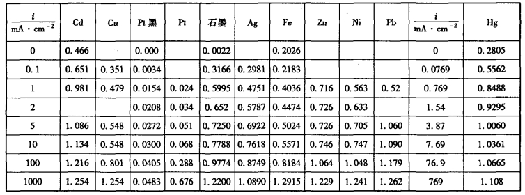 表7—7 氢的超电势, -ηc/V(25℃ )