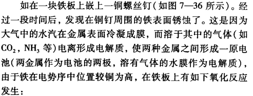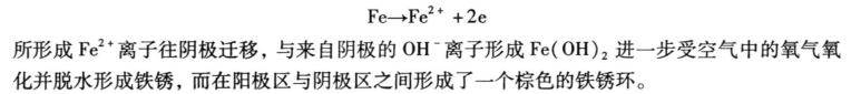 构成了阴极区。而在液滴之下铁的表面上构成了阳极区,发生铁的腐蚀反应: