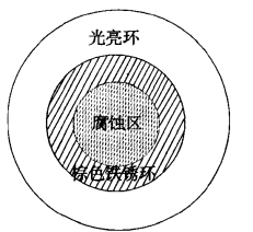 金属中常有其他微量金属作为杂质存在,故易形成局部电池——常称为“微电池”。在微电池中,作为阳极的金属腐蚀,暴露于空气中时氧气在作为阴极的金属上反应。有时候,在同一金属的各个部分氧气的分布不均匀时,也容易因氧气浓度差别而构成微电池。例如,在一块铁板的清洁表面上滴上一滴电解质溶液作为腐蚀介质,数天后可以发现在液滴所在圆圈中心已腐蚀掉,而在原来液滴的外缘上形成一发亮的带环,带环与中心之间形成了一棕色的粉屑构成的圆圈,如图7—37所示。实验现象可解释如下:液滴之下氧气较边缘上贫乏,在边缘上易发生如下反应:
