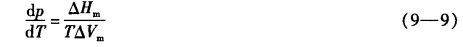 式(9—9)称为克拉佩龙方程,式中的T及p既表示环境的温度及压力,又为系统的温度及压力,此式适用于单元系的任意两相平衡,对于蒸发或升华,p为外压,也是饱和蒸气压,对于熔化及晶型转变,则p表示外压。
