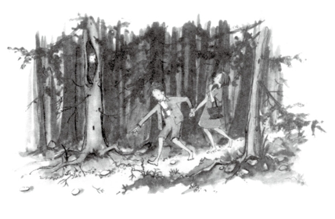 继母把孩子们领进他们一辈子都没有到过的深深密林,到了那儿又生起一大堆火。继母说:“好好待在这儿,你们两个要是困了,可以睡一会儿。我们去林子里砍木头,傍晚活干完了就来接你们。”到了中午,格莱特让亨塞尔分着吃她的面包,因为他的那块已经撒在路上。随后,兄妹俩又睡着了。过了半夜,仍没谁来接这两个可怜的孩子。等他们醒来,四周已一片漆黑。亨塞尔安慰自己的小妹妹说:“别着急,格莱特!月亮一出来,我们便看得见撒在地上的面包屑,它们会指给我们回家的路。”月亮升起来了,兄妹俩准备动身,可却不见一点儿面包屑,因为成千上万只鸟儿在树林间和田野上飞来飞去,面包屑全让它们给啄走啦。亨塞尔对格莱特说:“我们肯定能找到路!”可事实上却没能找到。他俩走啊走啊,走了一个通宵又从早到晚走了一整天,可就是走不出森林。他们已经很饿很饿,因为除去地上长的几颗草莓,他们什么也没得吃啊。同时,他们已疲倦得两条腿再也走不动了,就倒在一棵树下睡着了。