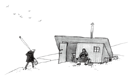 从前,有个渔夫和他妻子住在紧临大海的小渔舍里。渔夫每天都去海边钓鱼,他老是钓啊,钓啊。
