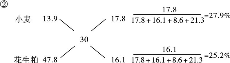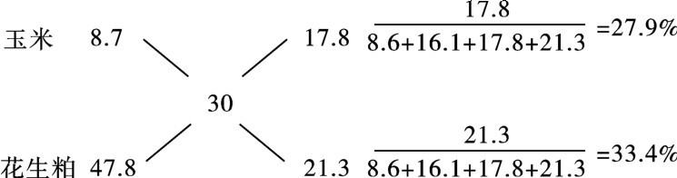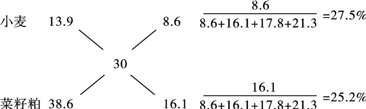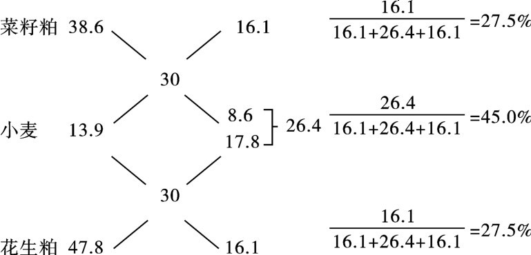 (2)多种原料的配合 若用粗蛋白质含量分别为13.9%、38.6%和47.8%的小麦、菜籽粕、花生粕配制含粗蛋白质30%的混合料,可将含量低于要求的小麦分别与含量高于要求的菜籽粕、花生粕进行四角计算,其用量为两次计算值之和,即小麦、菜籽粕、花生粕的配合比例应为26.4∶16.1∶16.1或45%、27.5%、27.5%。