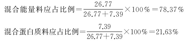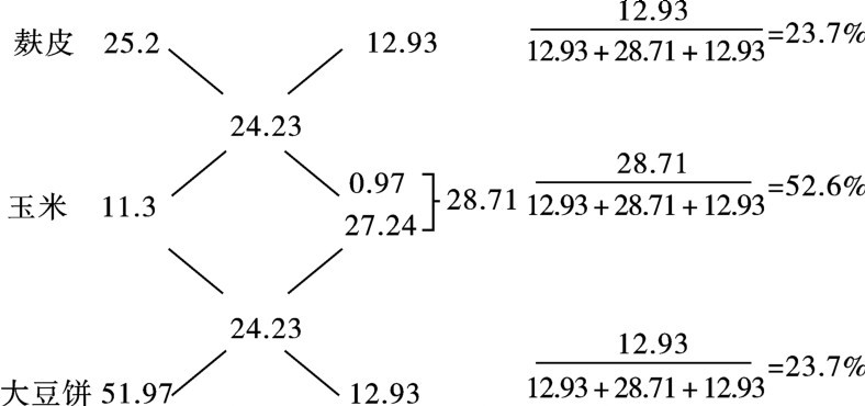 首先列出各原料和要配制的精料补充料中所含能量、蛋白质及蛋白质/能量(表43),用蛋白/能量进行交叉计算,得出的是各种原料应使用的能量之比。如算式所示,要配出蛋白质/能量为24.23的混合料,玉米、麸皮、大豆饼的能量之比应为28.71、12.93和12.93,或分别占52.6%、23.7%和23.7%。