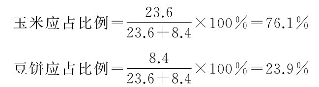 玉米应占60%×0.7837×0.98=46.1%,以此类推,高粱占15.4%,小麦麸15.4%,大豆粕14.8%,棉籽粕4.2%,菜籽粕2.1%,骨粉1.7%,食盐0.3%,合计100%。