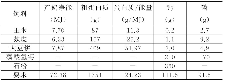因精料补充料需补充产奶净能72.38MJ,故应由玉米、麸皮和大豆饼提供的产奶净能分别为38.072MJ、17.154MJ、17.154MJ(72.38分别乘0.526、0.237、0.237)。相当于玉米4.94kg(38.072/7.7)、麸皮2.75kg(17.154/6.23)、大豆饼2.18kg(17.154/7.87)。验算结果,共含产奶净能72.38MJ、粗蛋白质1754kg,与要求完全一致。尚缺钙100.95g(111.5-4.94 ×0.2-2.75×1.1-2.18×3)和磷42.15g(91.5-4.94×2.7-2. 75×9.2-2.18×4.9)。由于磷酸氢钙既含钙又含磷,石粉只含钙。因此,首先用磷酸氢钙满足磷的需要,应用磷酸氢钙0.25kg(42.15/170);再用石粉补足钙,需用石粉0.12kg[(100. 95-0.25×232.9)/360]。另加食盐1%~2%,约合0.16kg。混合料总量为10.4kg(4.94+2.75+2.18+0.25+0.12+0. 15)。其组成为玉米47.5%、麸皮26.4%、大豆饼21%、磷酸氢钙2.4%、石粉1.2%、食盐1.5%,即每头牛除粗料外每天喂这样的精料补充料10.4kg,就可满足需要。