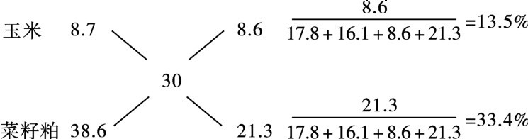 如果还有玉米(粗蛋白质含量8.7%),则可将玉米、小麦分别与菜籽粕、花生粕进行四角计算。可有两种结果,玉米、小麦、菜籽粕、花生粕的用量分别为:①27.9%、13.5%、25.2%、33.4%,或②13.5%、27.9%、33.4%、25.2%。两种混合料粗蛋白质含量都是30%,但其他养分含量和价格不同,可进行选择。