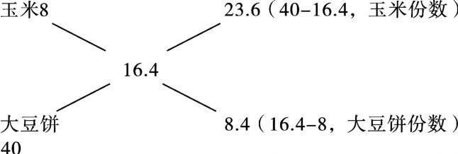 作交叉图,在图中央写上所要混合的饲料达到粗蛋白质含量16.4%;玉米和大豆饼的粗蛋白质含量8%和40%分别放在左上角和左下角;然后以左上、下角为出发点,分别通过对角线作交叉,大数减小数,差数分别写在右侧上下角。差数分别为两种饲料应在混合饲料中占的份数,然后再算成各占混合饲料的百分数。